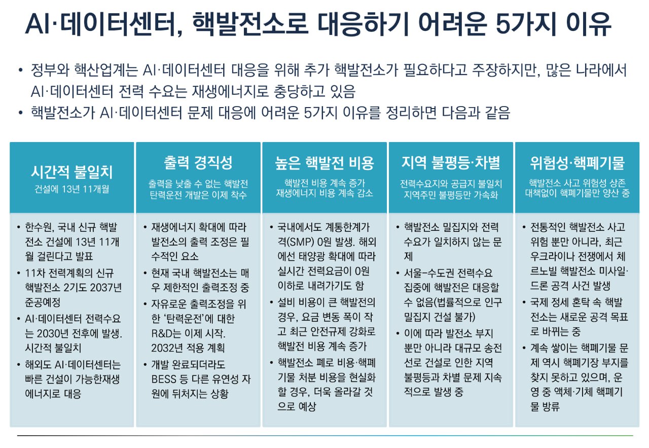 AI ¹× ¹ÝµµÃ¼ »ê¾÷¿¡ µû¸¥ Àü·Â ¼ö¿ä°¡ ½Å±Ô ÇÙ¹ßÀü¼Ò¸¦ °Ç¼³ÇÒ ¸¸Å ±ä¹ÚÇÏÁö ¾Ê°í, ¿ÀÈ÷·Á °Ç¼³¿¡ 10³â ÀÌ»ó ¼Ò¿äµÇ´Â ÇÙ¹ßÀüÀº Çö½ÇÀû ¼±ÅÃÁö°¡ µÉ ¼ö ¾ø´Ù´Â ÁöÀûÀÌ ¸¹´Ù. ¶ÇÇÑ Çö Á¤ºÎ¿¡¼ ÃßÁø ÁßÀÎ Àç»ý¿¡³ÊÁö 100GW Á¤Ã¥°ú Ãæµ¹ÀÌ »ý°Ü Àü·Â ¼ö±ÞÀÇ ºÒ¾ÈÁ¤¼ºÀÌ Ä¿Áø´Ù´Â ÁöÀûÀÌ È®»êµÇ°í ÀÖ´Ù.